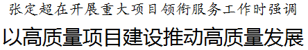 调研中张定超强调,重大项目建设是推动经济高质量发展的重要引擎。全市各级各部门要坚持产业为先、项目为王、企业为基、效益为本,主动上心上手,加强项目建设服务保障,确保实现“双过半”,为完成全年经济社会发展目标奠定坚实基础。要把安全生产和生态环保贯穿项目建设全过程,加强施工现场管理,严格执行各项规程,做到安全生产、生产安全。